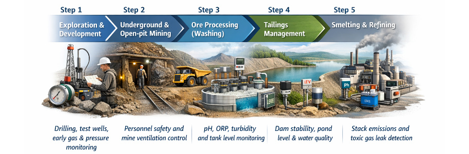 - Gas sensors – monitoring combustible and toxic gases inside boreholes, such as methane (CH₄) and hydrogen sulfide (H₂S), to prevent explosions and poisoning.